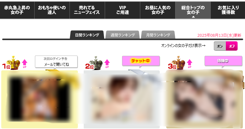ランキング上位の娘が「チャット中」表示なら迷わず突撃。混雑覚悟でも行く価値アリです。